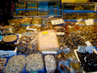 On Saturday I went to Noryangjin fish market in Seoul which is basically 66,000 square meters of fresh seafood, mostly live. As we walked on the overpass, I knew we were close as the smell became more and more potent. The odor was no where near as bad as I had expected, though. We obviously left smelling like seafood, but since it was so cold outside, and inside the market for that matter, I was not overwhelmed with fishiness. I have no idea how you would choose between the vendors; each row had about 15 different stands, all selling the same type of sea creature. This is the view from above: