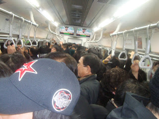 The public transportation system is pretty nice here; clean, easy and relatively efficient. I hadn't experienced the subway during peak rush hour until this weekend. It is pure insanity. As the train approached, we were essentially herded into the car, bouncing off everyone around us. I was able to get my arm up to take a picture: