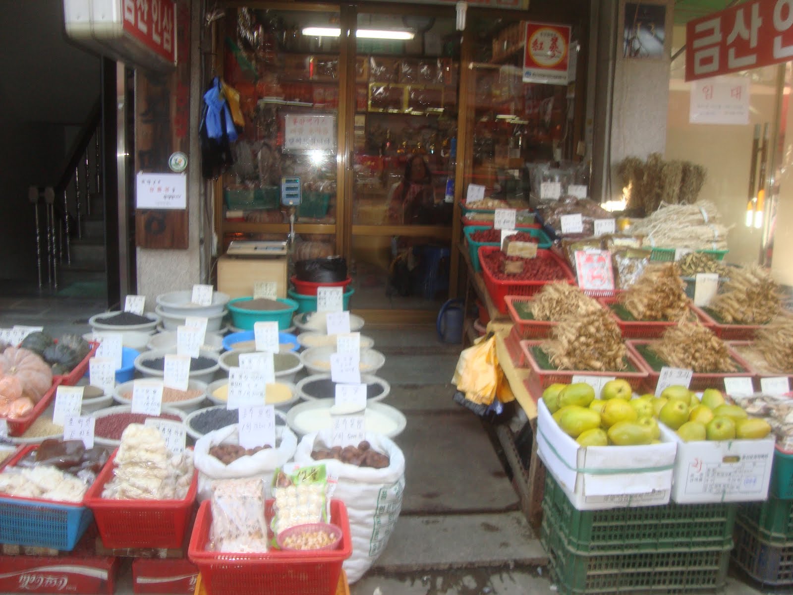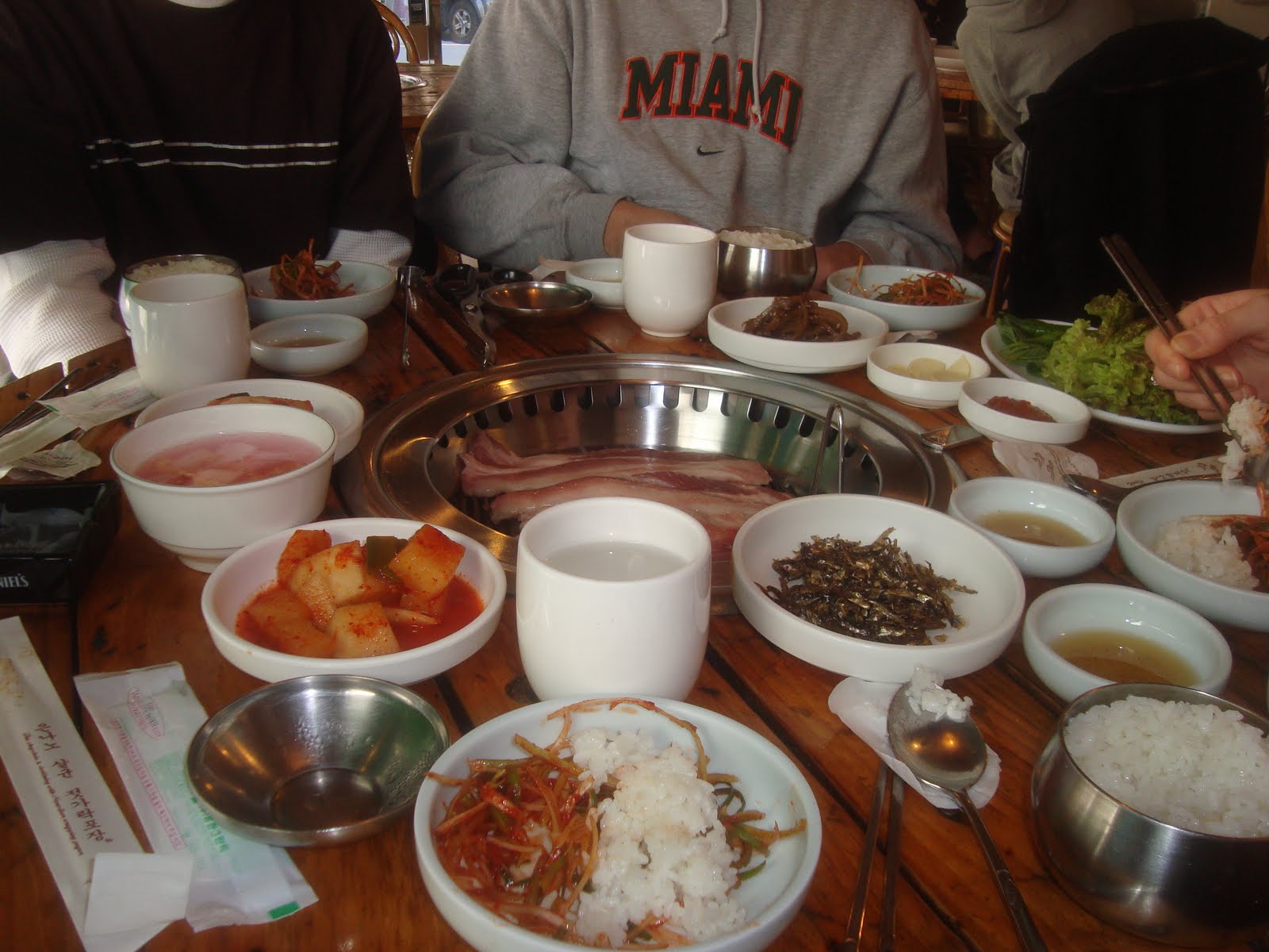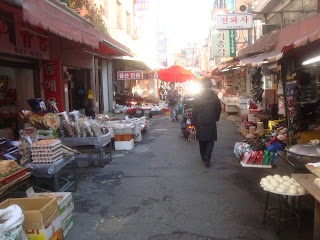 We stopped for lunch at a Korean barbeque on one of the side streets. Thankfully, one of the guys we were with spoke Korean. We left the talking/ordering up to him. The server gave us an assortment of side dishes called "bonchon" along with raw beef or pork that is meant to be grilled yourself in a small pit in the center of the table. Check out this spread, delicious!
