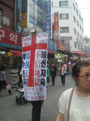 As we walked, we heard someone yelling something over a loudspeaker. We soon found out it was just a recording, as the loudspeaker was actually strapped on to the giant poster contraption that this man wore. I didn't get a good picture because despite the extra weight on his back, he was moving quite fast. And also some idiots kept walking in front of him (probably to protect his message). If you cannot read what the back says, It's "Lord Jesus Heaven; No Jesus Hell." There is NO grey areas for this dude.