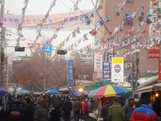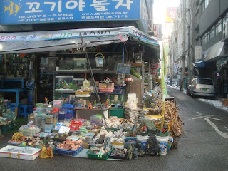 On Saturday I went to Noryangjin fish market in Seoul which is basically 66,000 square meters of fresh seafood, mostly live. As we walked on the overpass, I knew we were close as the smell became more and more potent. The odor was no where near as bad as I had expected, though. We obviously left smelling like seafood, but since it was so cold outside, and inside the market for that matter, I was not overwhelmed with fishiness. I have no idea how you would choose between the vendors; each row had about 15 different stands, all selling the same type of sea creature. This is the view from above: